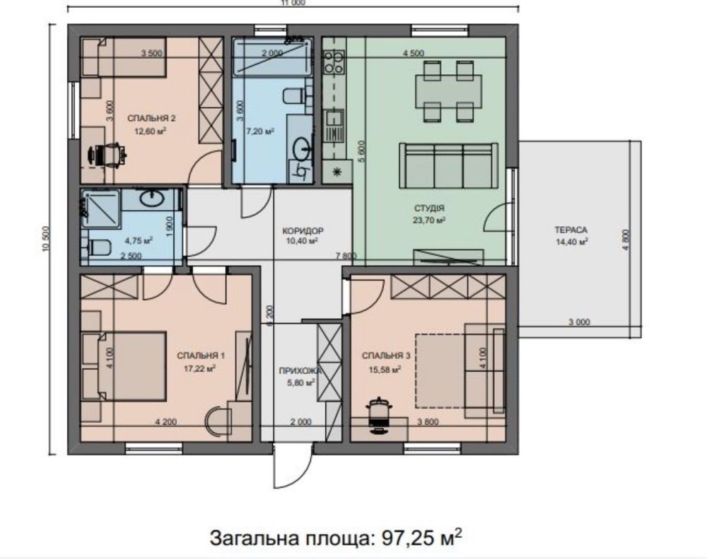 • 3 окремі спальні