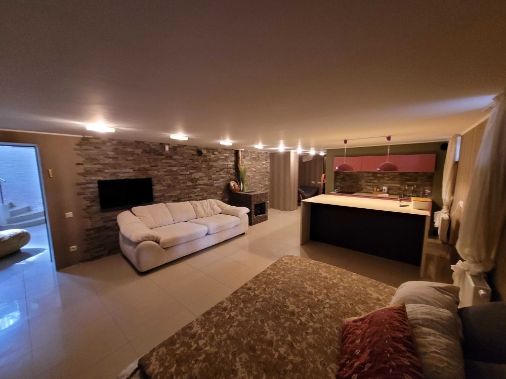 0 поверх: кімната студія з кухнею, санвузол, гардеробна, вихід до гаражу, котельня.