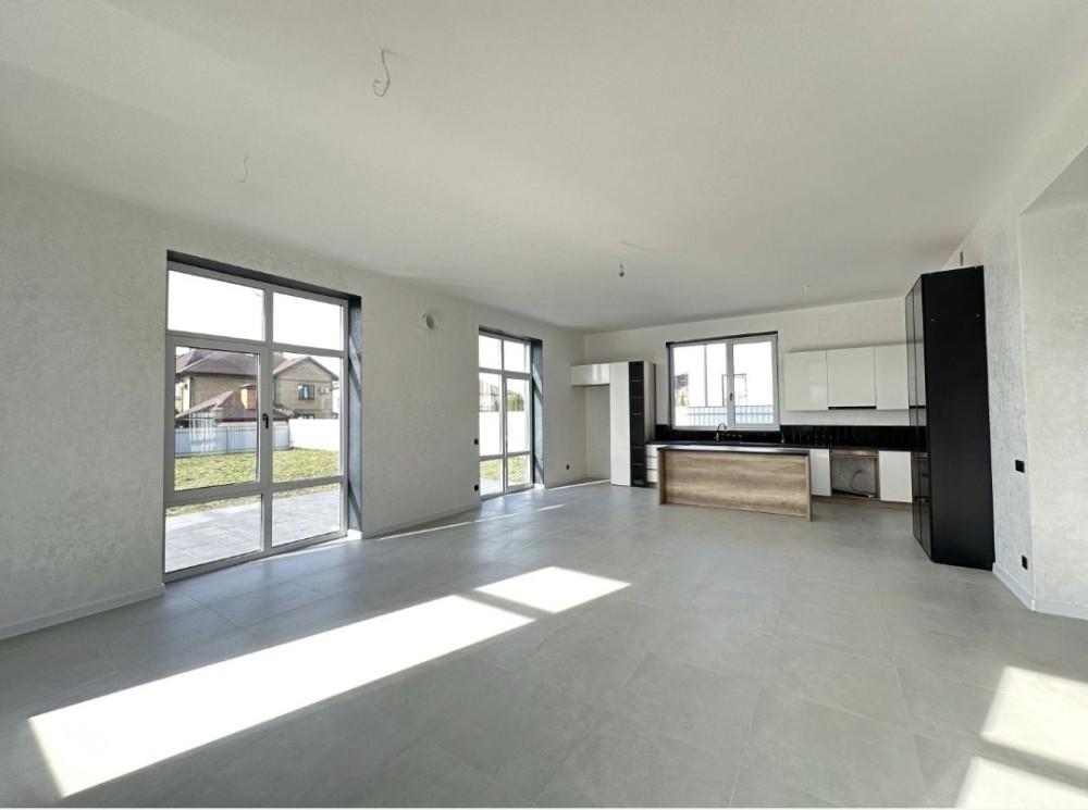 Велика простора кухня - вітальня - камінна з виходом на терасу