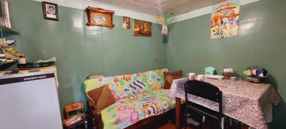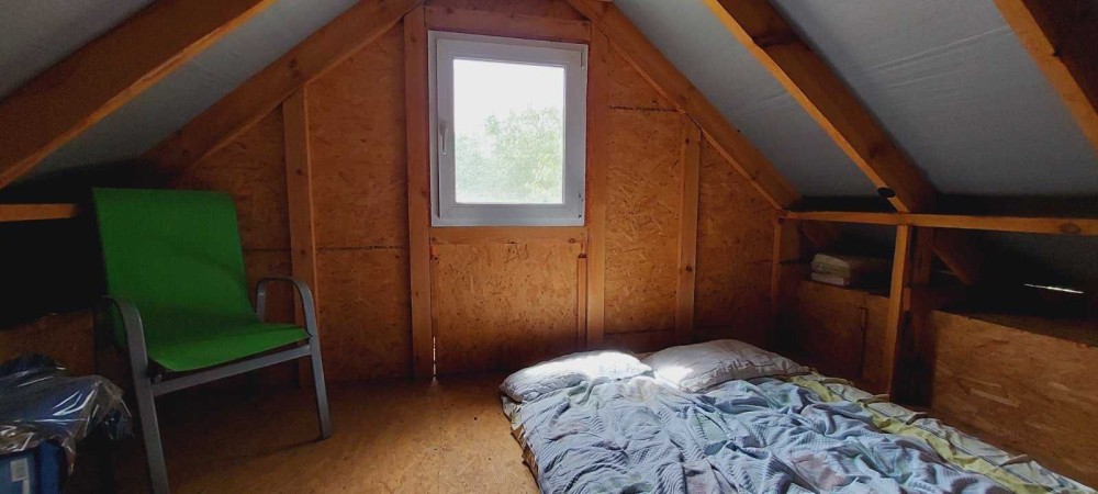 Будиночок із дерева, має два поверхи. На першому поверсі кухня із спальним місцем. На другому поверсі кімната з видом на ділянку.