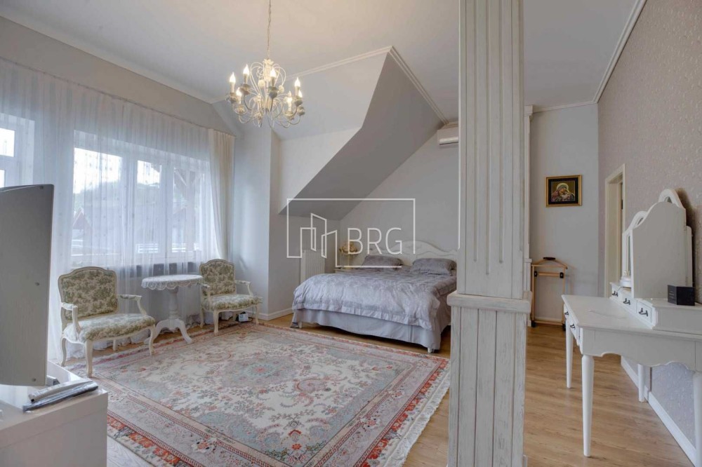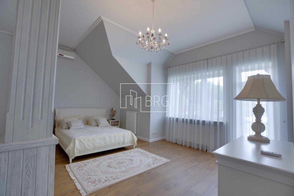Описание: 2 спальни с гардеробными, 2 детские спальни, гостиная, кухня – столовая, 6 с/у, гараж на 2 автомобиля