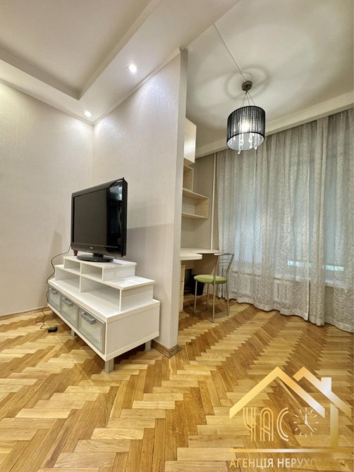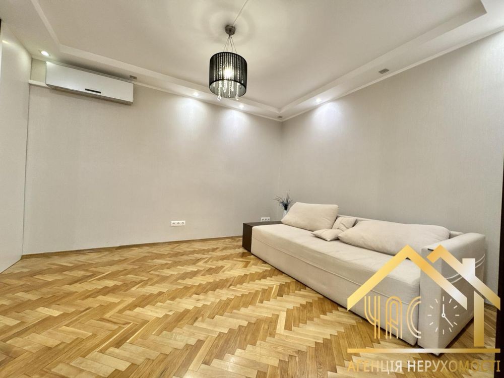 Перша кімната – затишна та функціональна: розкладний двоспальний диван, телевізор, кондиціонер, робоче місце для навчання чи віддаленої роботи, велика шафа для одягу. Підлога – натуральний паркет.