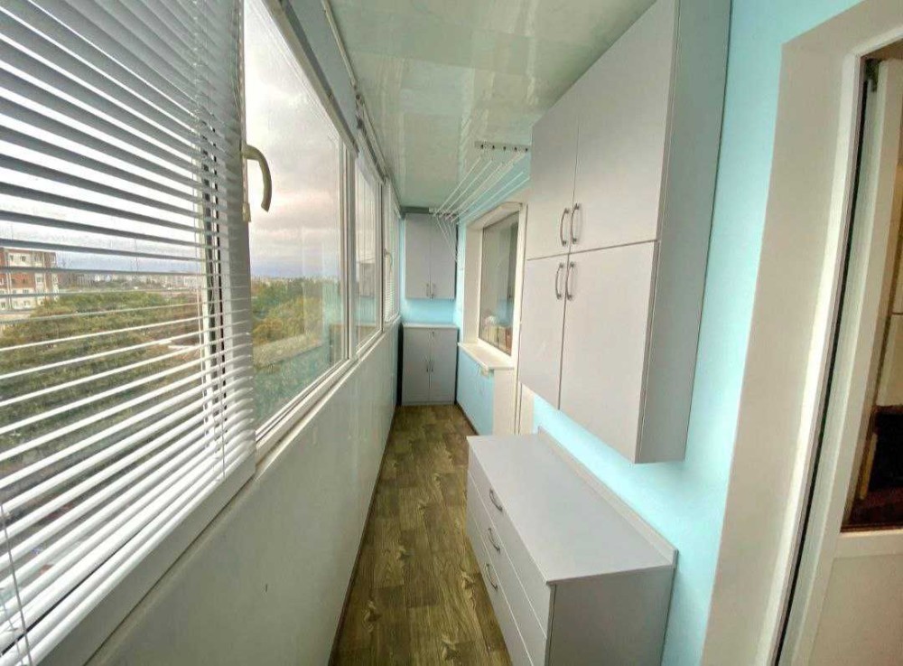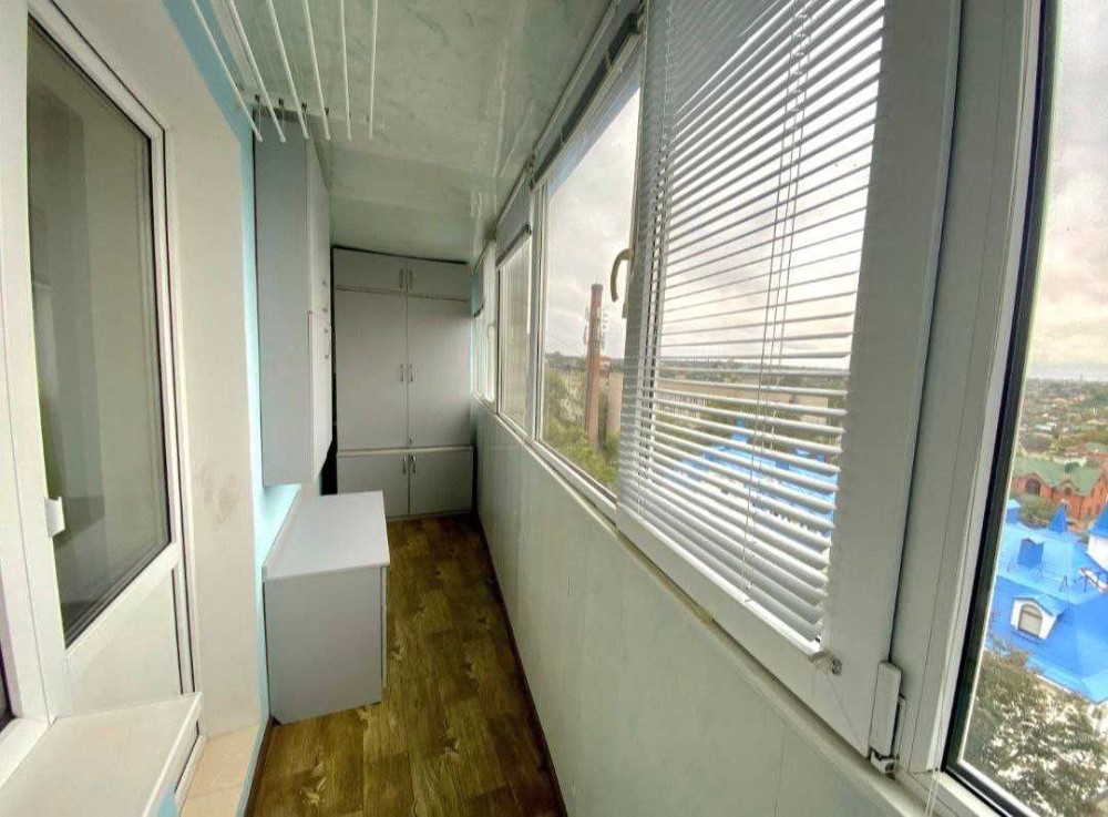 Велика лоджія, яка з'єднує кухню та кімнату — місце для ранкової кави, відпочинку або роботи.