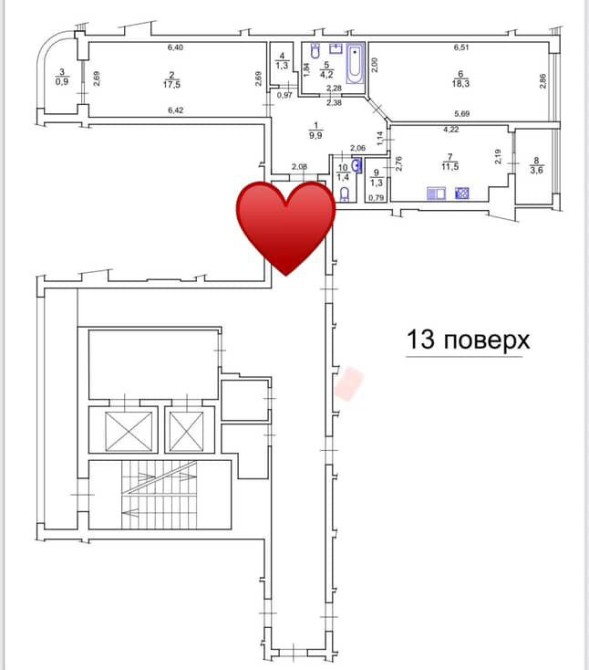 Квартира двостороння, має два балкони, гардеробну та два санвузли. Розташована на 13-му поверсі 15-поверхового будинку.