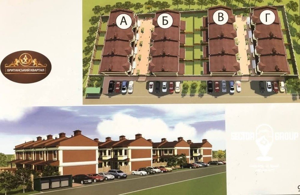 Проект на 8 двоповерхових таунхаусів по 115м.кв.+горище з власними земельними ділянками від 0.012 до 0.0194 га, та зонами загального користування з алеєю та місцем для паркування авто.