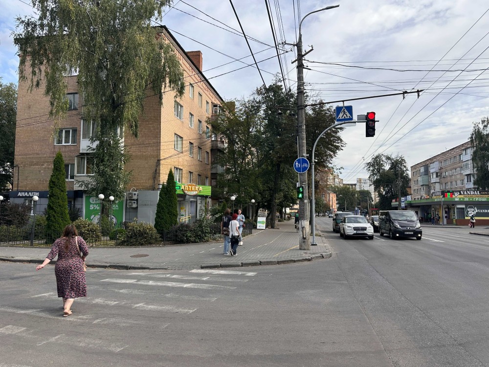 Фасад артеріальної вулиці з великим автомобільним та пішим потоком.