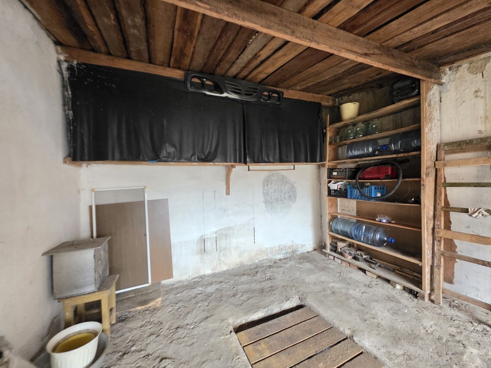 Є яма для огляду днища або зберігання чогось та кілька стелажів.