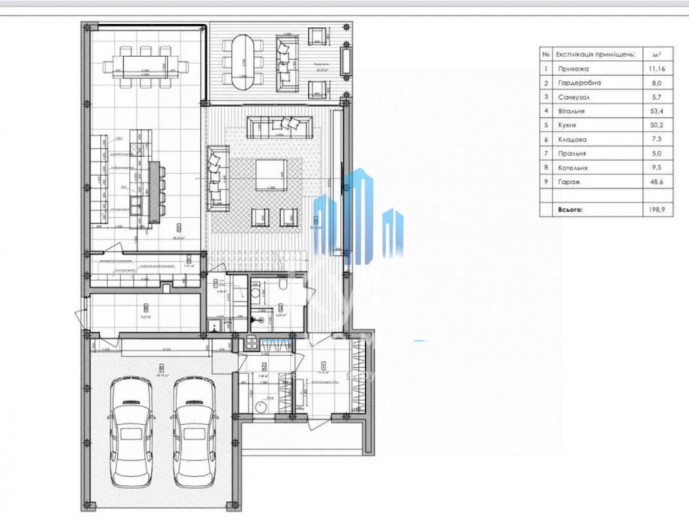 Загальна площа будинку 444 кв.м. (344 кв.м. - житлова площа; 50 кв.м. - гараж; 50 кв.м. - тераса;). Поверхів 2. Кімнат 5, спалень 3.