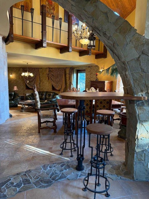 У будівництві цього розкішного будинку використано лише найкращі натуральні матеріали: натуральний камінь, дерево, ковані метали та натуральна черепиця. Це не лише забезпечує високу якість будівництва, але й надає інтер’єру елегантності та унікальності.