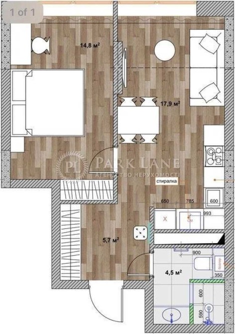 • Площа: 43 м² (житлова — 13 м², кухня-вітальня — 17,9 м²)