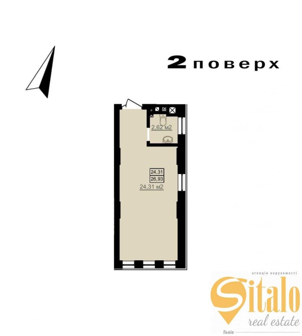 Площа становить 27 м.кв. Окремий санвузол на 2.6 м.кв із вікном.