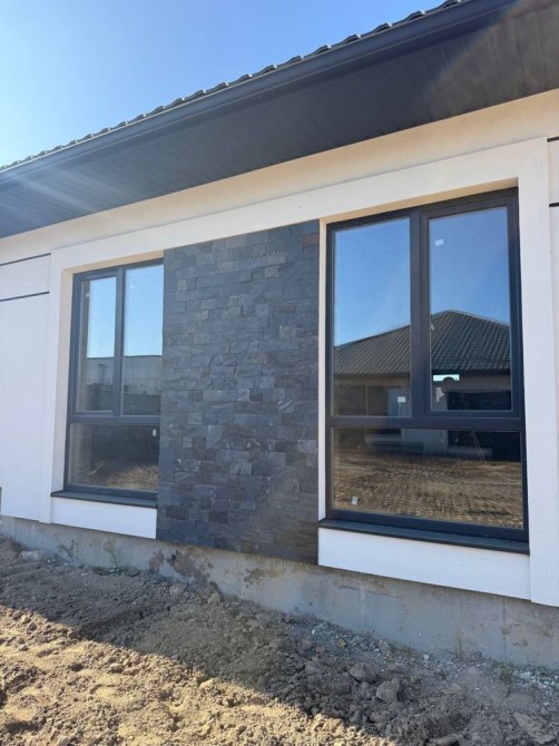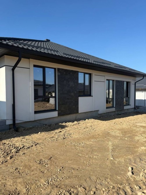 Повністю пофарбований та оздоблений фасад, встановлені софіти, водовідливи, вікна та вхідні двері.