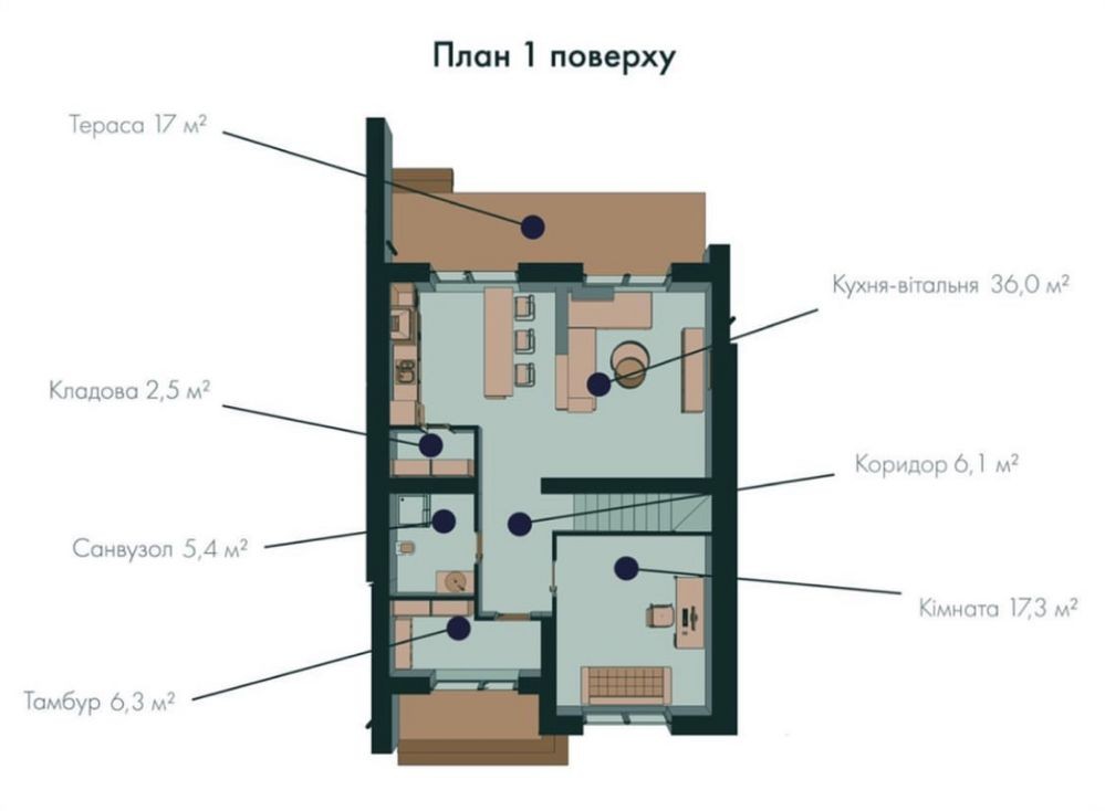 -кухня-вітальня ( 36м2.)з виходом на терасу( 17м2.)