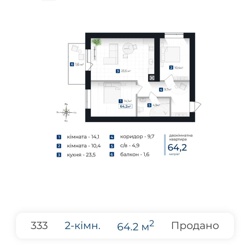 • Загальна площа 64.2 м2