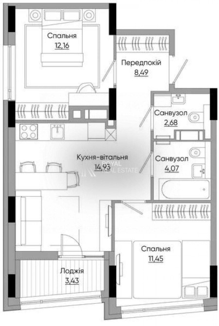 Житлова кімната — 12,1 м²