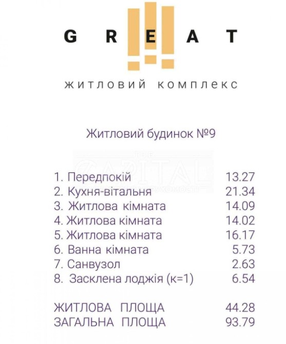 Пропонується на продаж 3 кімн. квартира в ЖК GREAT у будинку №9, площа: 93,79\21,34\44,28.