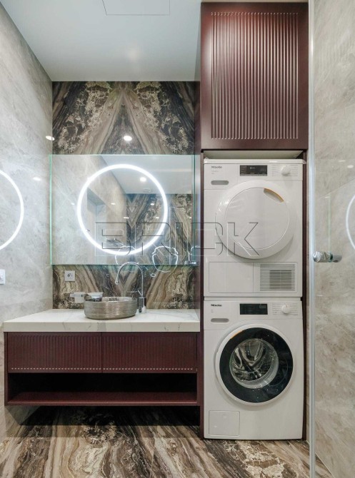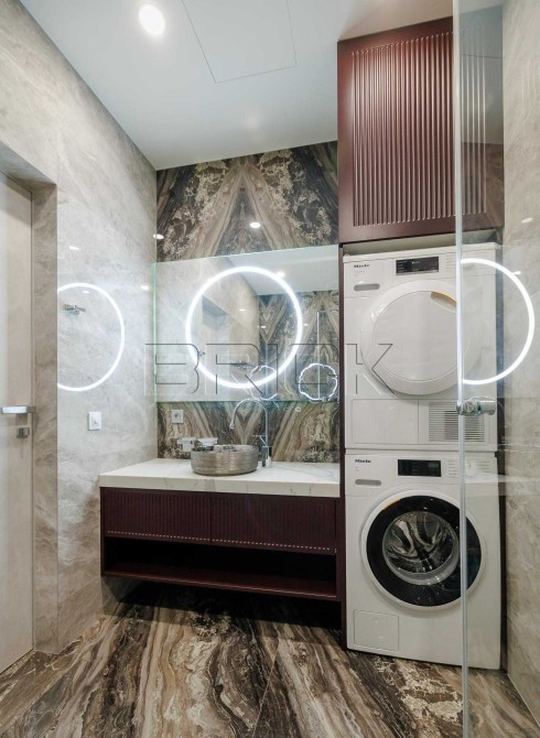 Техніка: пральна та сушильна машини Miele, комплект Bosch (холодильник, варильна поверхня, духова шафа, посудомийна машина, кавомашина), сантехніка Villeroy Boch, Geberit, Fiore, вимикачі Niessen, мийка Franke.