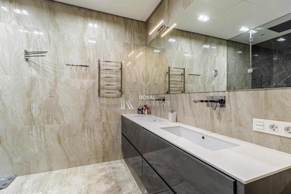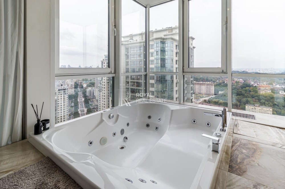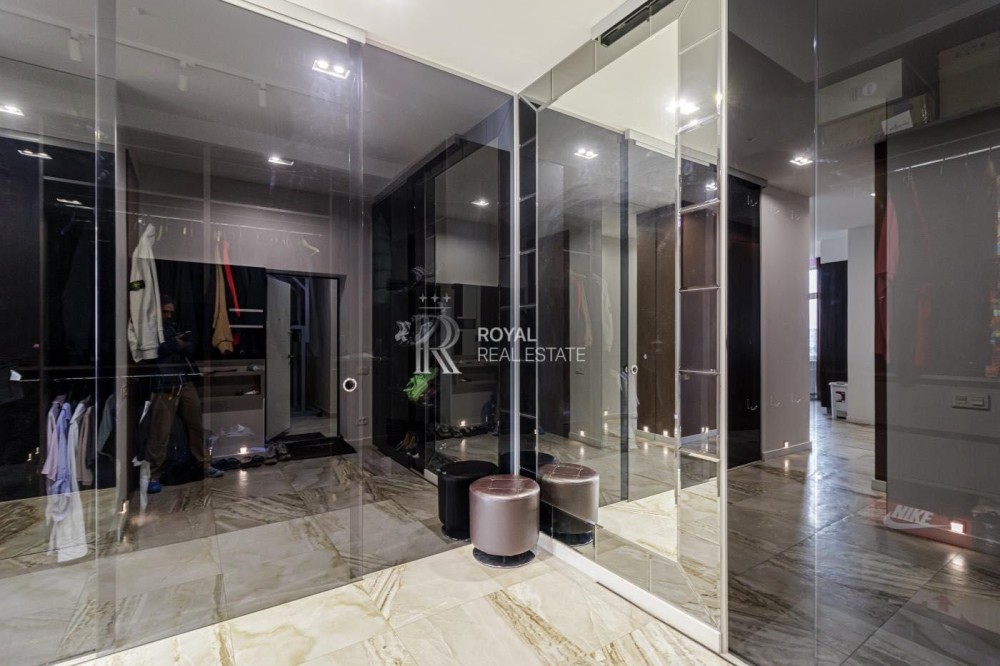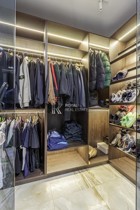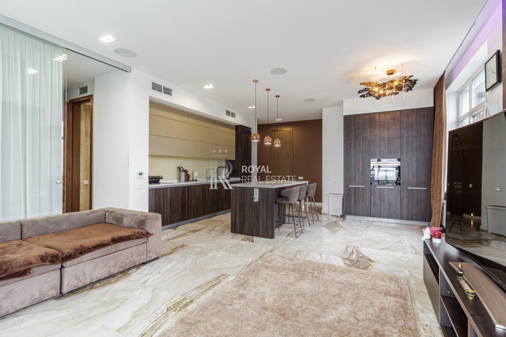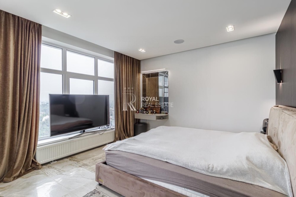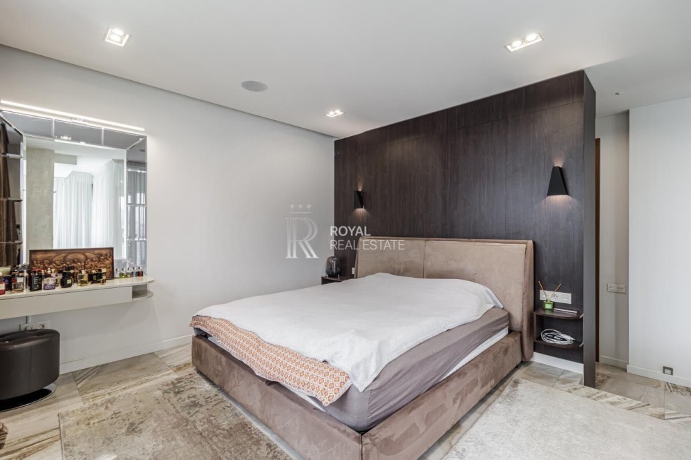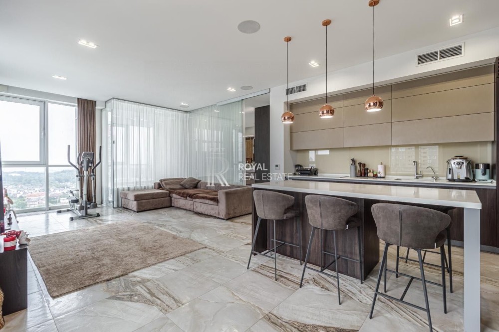 Загальна площа 120м.,кв., простора кухня-вітальня, майстер-спальня з гардеробною та санвузлом з душем та джакузі з панорамними вікнами, дитяча кімната, гостьовий санвузол, дві гардеробні, пральна кімната.