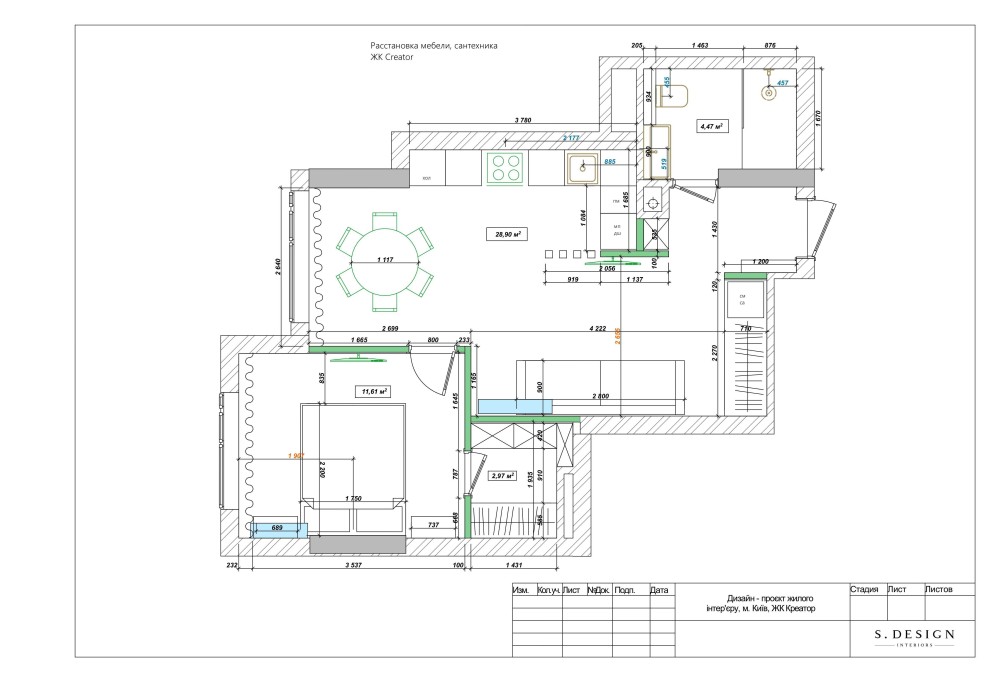 Квартира на дві сторони, з великою кухнею (за допомогою зонування перетворюється в 3к квартиру), окреме приміщення для гардеробу.