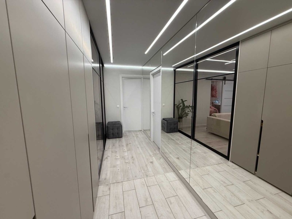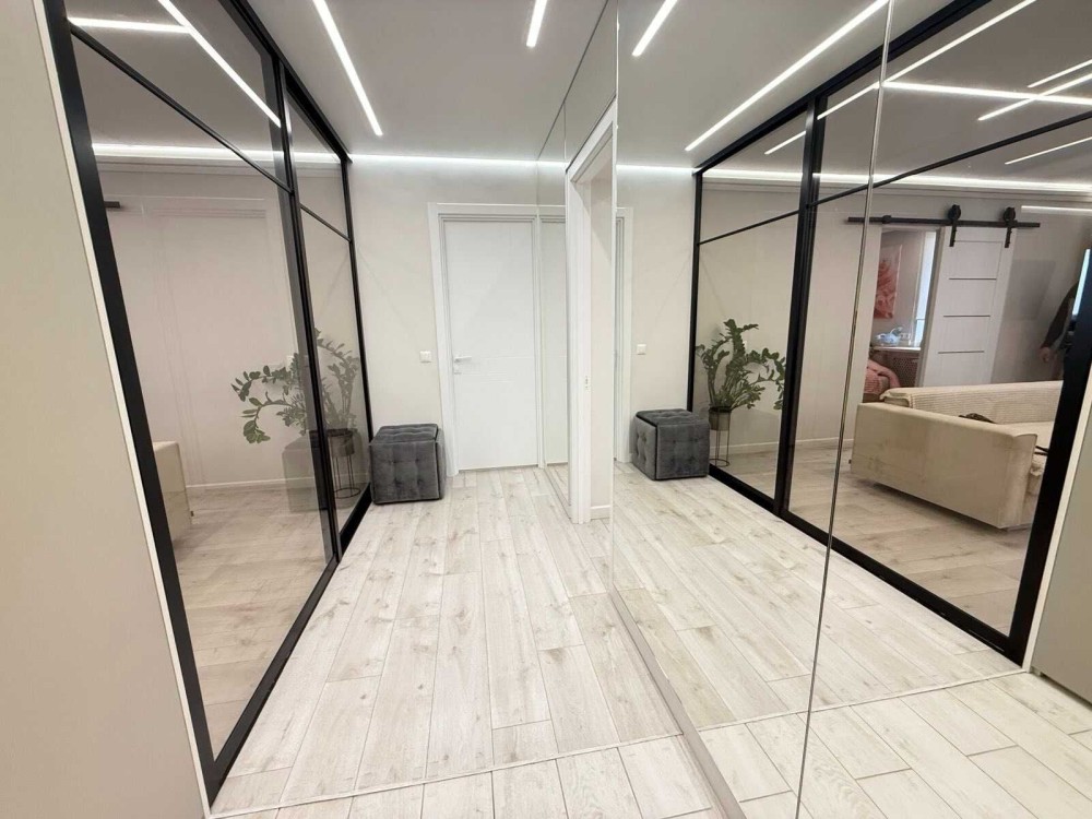 У квартирі використані дзеркальні перегородки, які додають простору та світла, створюючи сучасну й стильну атмосферу. Дизайн виконаний у гармонійних відтінках з акцентом на комфорт та естетику.