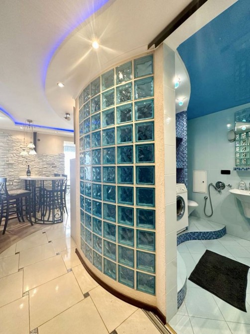 - Ванна кімната з італійською плиткою та напівкруглим душем зі склоблоками.