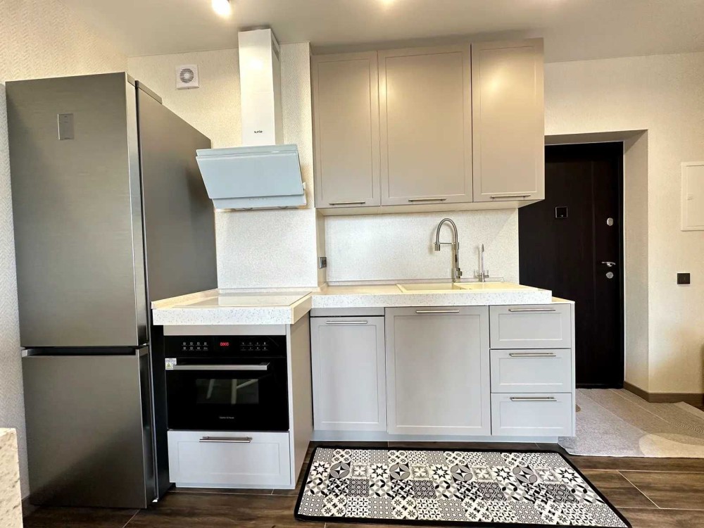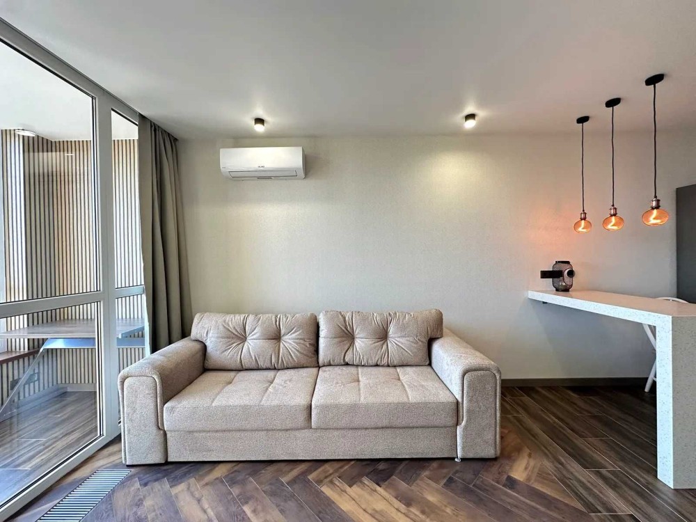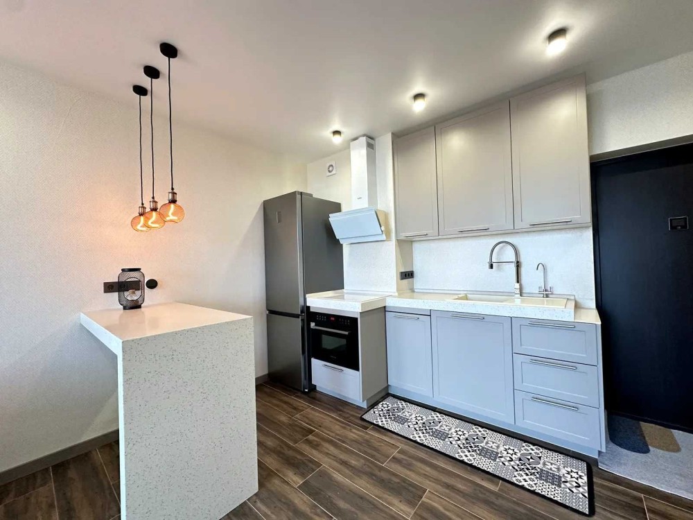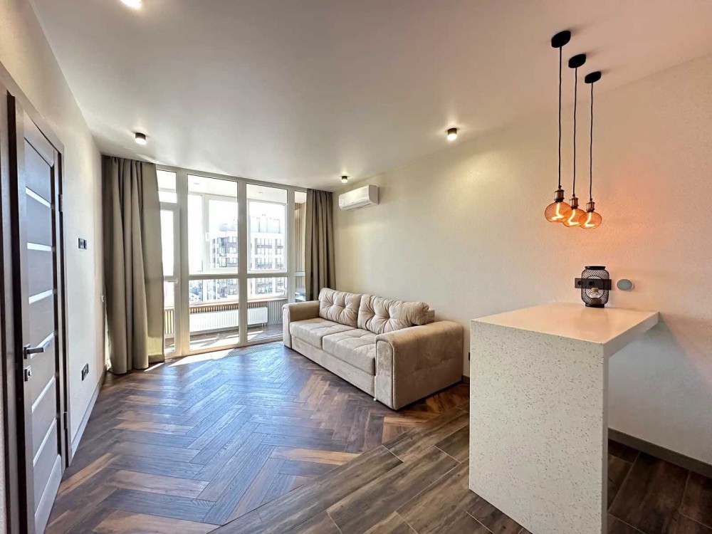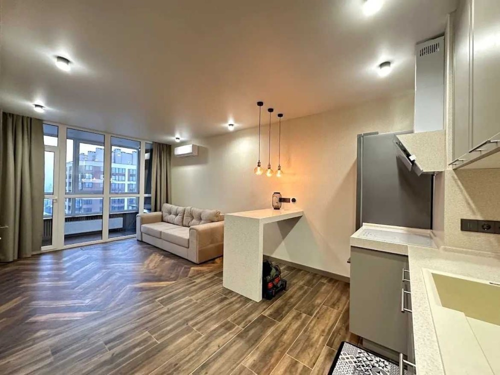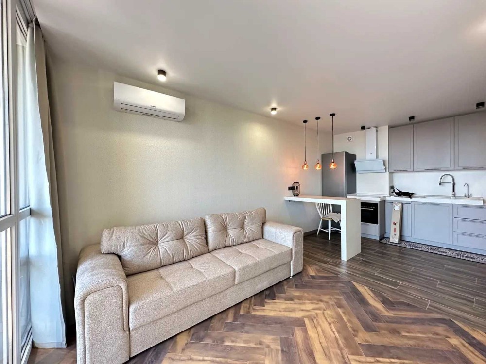 Кухня: посудомийна машина, духовка/микрохвильовка, варильна поверхня, витяжка, кондиціонер, диван, барні стільця, барна стійка, журнальний столик.