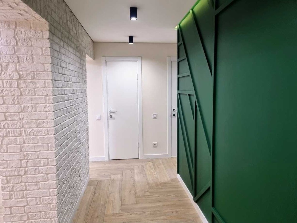 Якісні матеріали обробки: натуральні відтінки дерева, декоративна цегла, тепле LED-підсвічування.