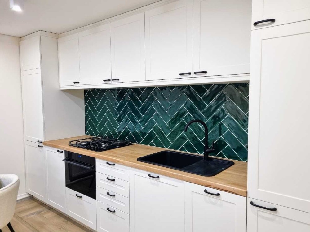 Простора кухня-студія з панорамними вікнами та зоною відпочинку ідеальне місце для вечорів із сімєю чи друзями. Сучасний кухонний гарнітур з білими фасадами, деревяною стільницею та ефектним фартухом із смарагдової плитки в ялинку створює атмосферу елегантності.
