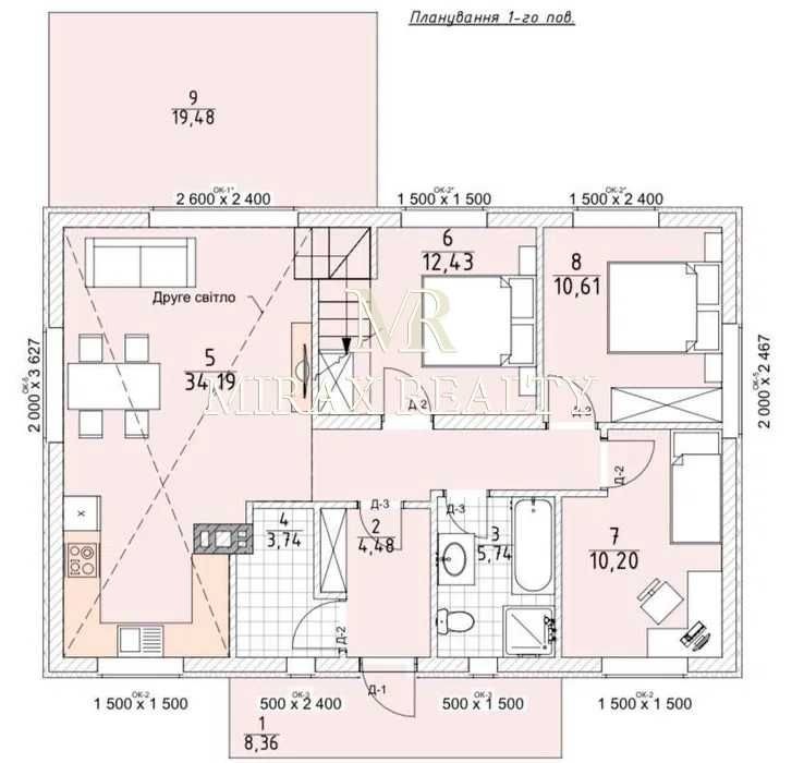 Функціональне планування, вітальня з другим світлом, каміном та виходом на терасу, кухня, 3 спальні, ігрова/кабінет, 2 санвузли, технічне приміщення.