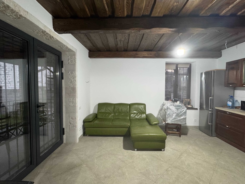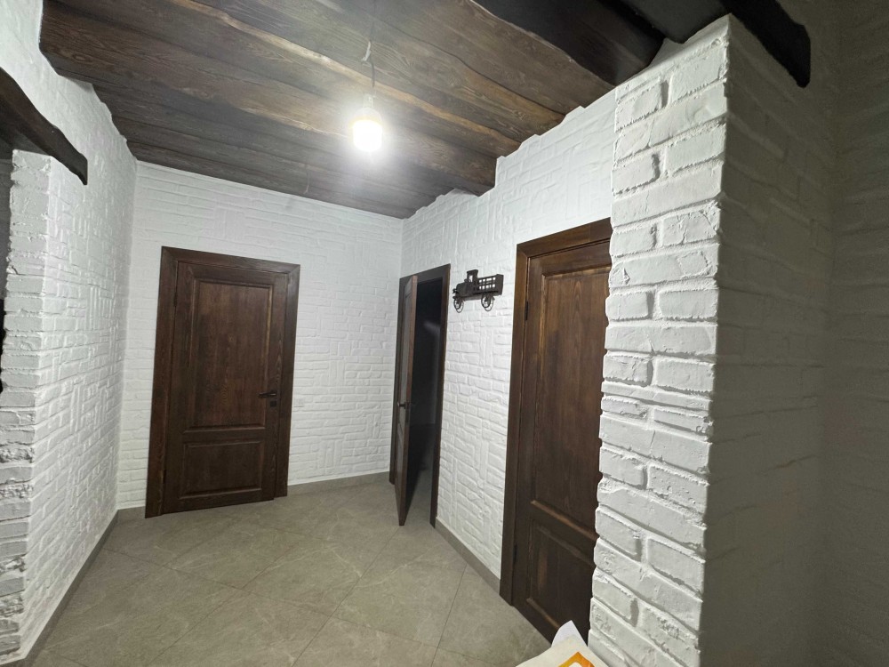 Ззовні утеплений і зроблено дорогий якісний фасад натуральним каменем, дах, вікна, освітдення, всередині почали робити камін і завели воду (але внутрішні роботи ще не завершені).