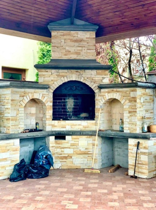 - Перший поверх облицьований каменем травертин.