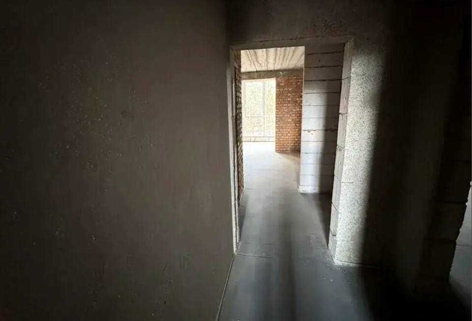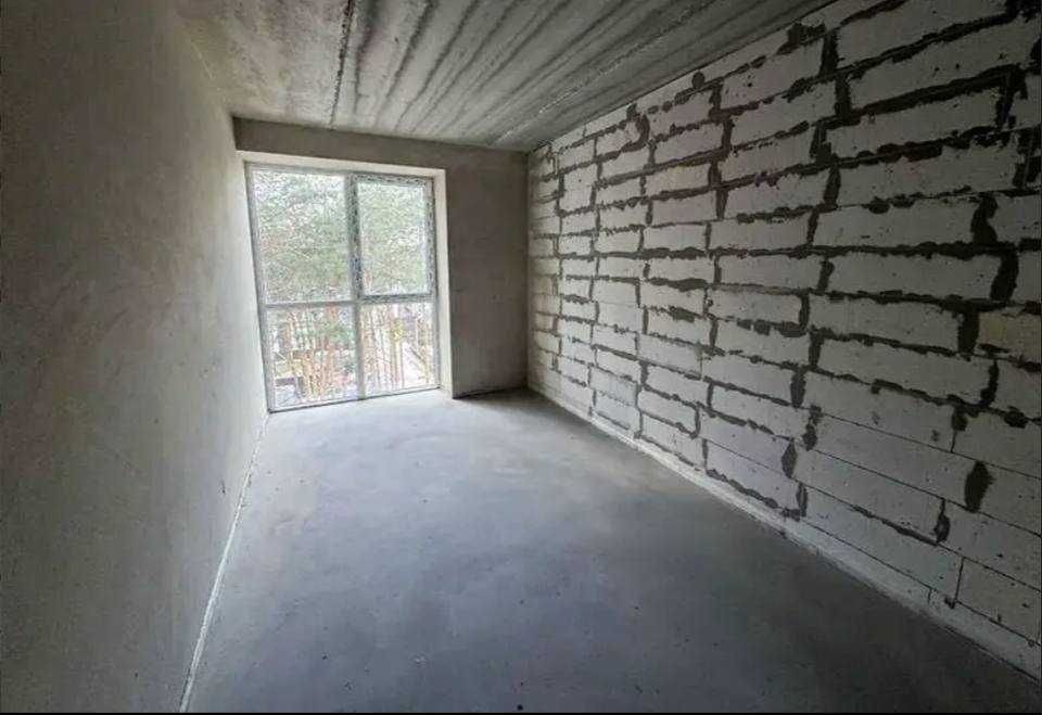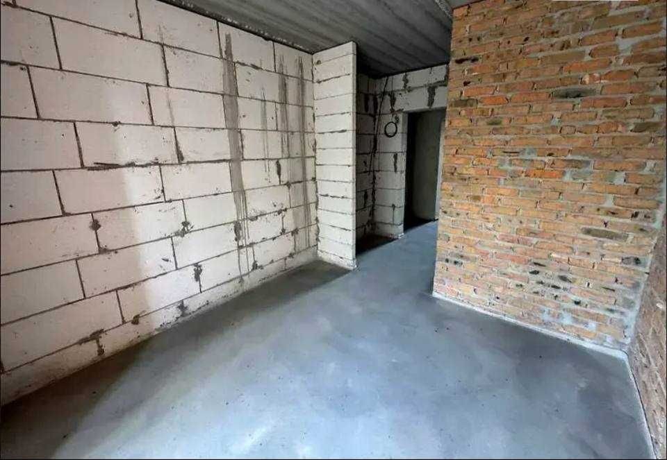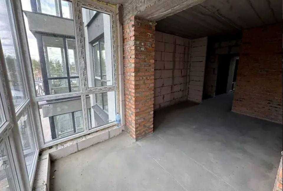Простора квартира з великою кухнею-студією і шикарними панорамними вікнами. На підлозі лазерна стяжка, стіни з чорновою штукатуркою.