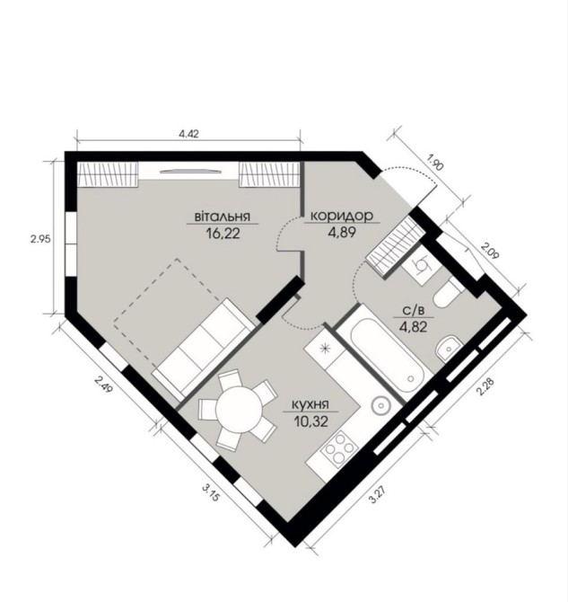 • Площа кухні 10.32 м2
