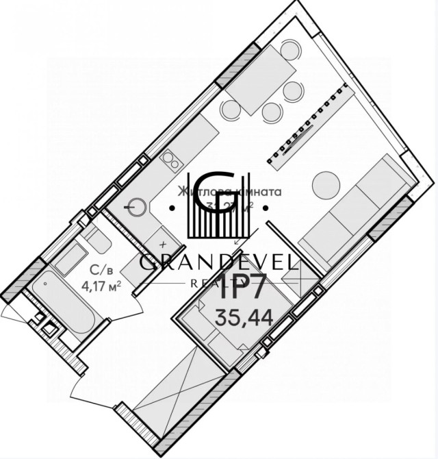 1-кімнатна (студія). Загальна площа: 36 м².
