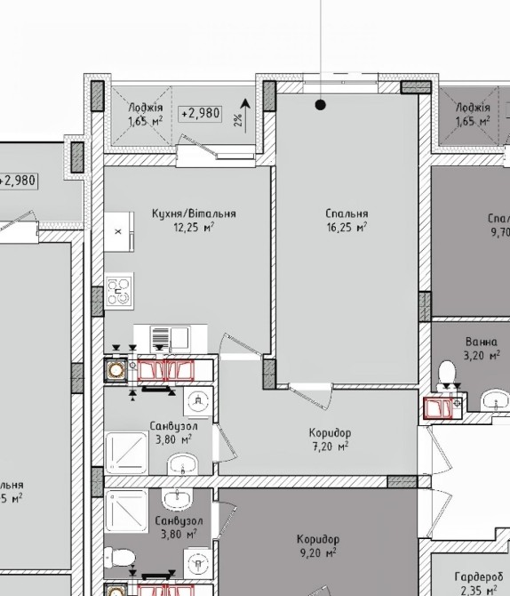 Плануванням квартири передбачено велику окрему кімнату, кухню з виходом на закриту лоджію, санвузол та коридор з місцем під гардеробну.