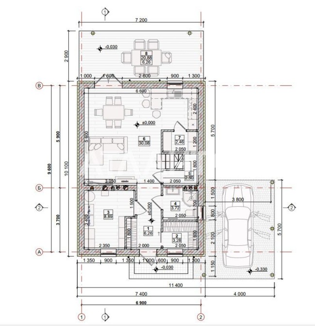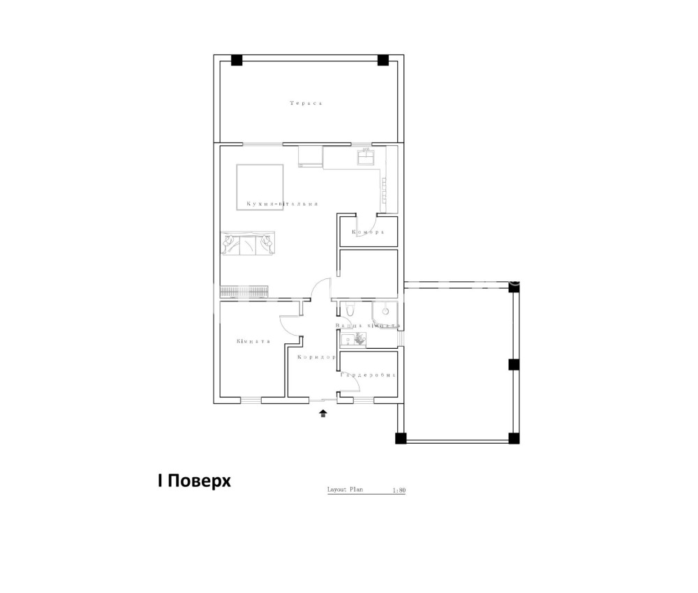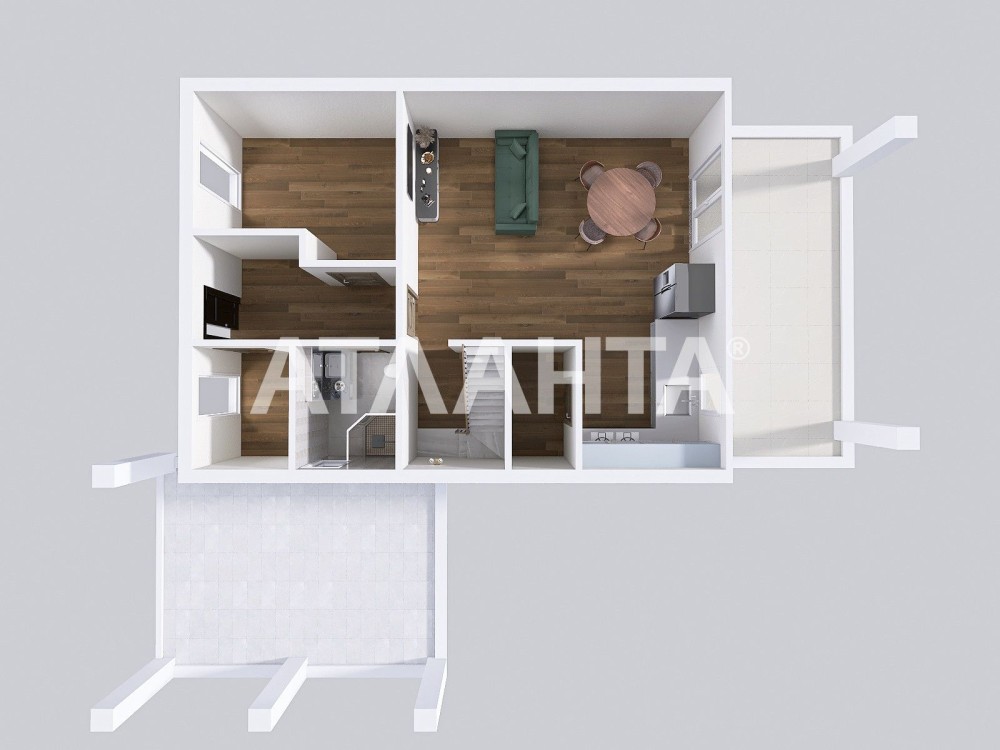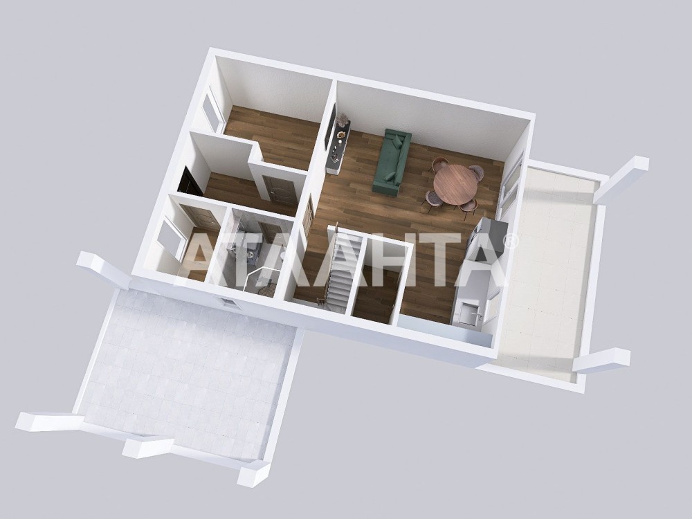 • На першому поверсі передбачено простору кухню-вітальню з виходом на патіо, технічне приміщення та санвузол.