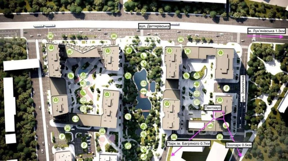 На даху розташована велика тераса з панорамним видом – зоопарк та парк ім. Багряного, який не буде перекрито новою забудовою. Вікна виходять на південно-західну сторону, тому завжди буде достатньо світла та тепла.