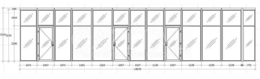 * Фасад, скляна вітрина по всій вхідній групі.