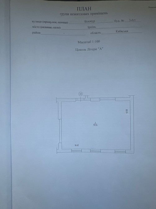 Продається приміщення в Ірпіні, 52,6м2, без ремонту після будівельників. Власник. Без комісії. Цоколь з вікнами. Під любий вид діяльності. Деталі за телефоном. Ціна 632000 гривень
