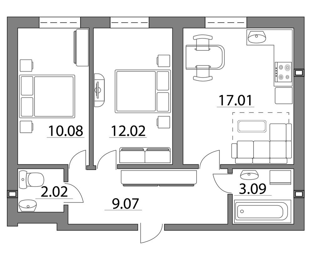 2к квартира 56м2 має дві роздільних кімнати, два сан вузли та велику кухню-вітальню! Дуже продумане та раціональне планування, де всім вистачить місця та комфорту. Такі квартири можна подивитися вживу в нашому шоурумі!