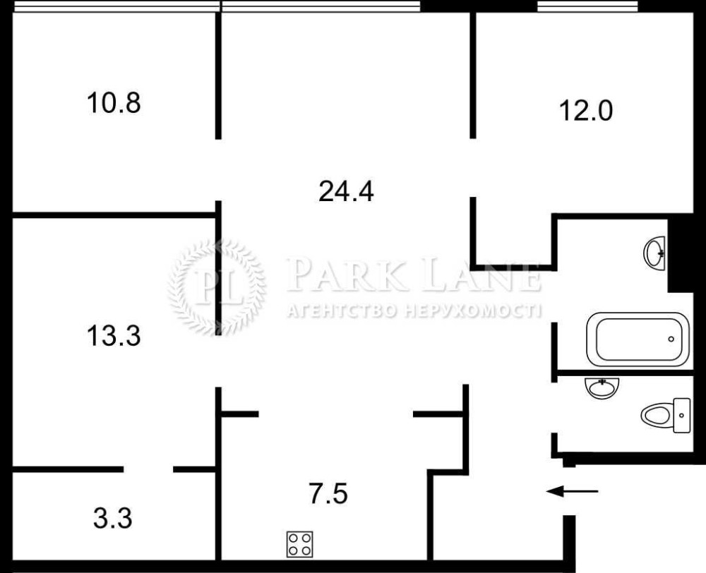 Зона кухні суміжна з вітальною кімнатою, загальна площа вітальні з кухнею 32,3 м.кв. Спальня - дитяча (12 м.кв). Майстер-спальня 24,1 м.кв зонована: спальня 13,3 м.кв та зимній сад або кабінет 10,8 м.кв. Гардероб (3,3м.кв). Санвузол роздільний. Коридор 8,33 м.кв. Вбудована шафа в коридорі «Стерх». Висота стелі 2,90 м. Якісна столярка. Вся інфраструктура поруч, супермаркети, школи та дитячі садки, метро.