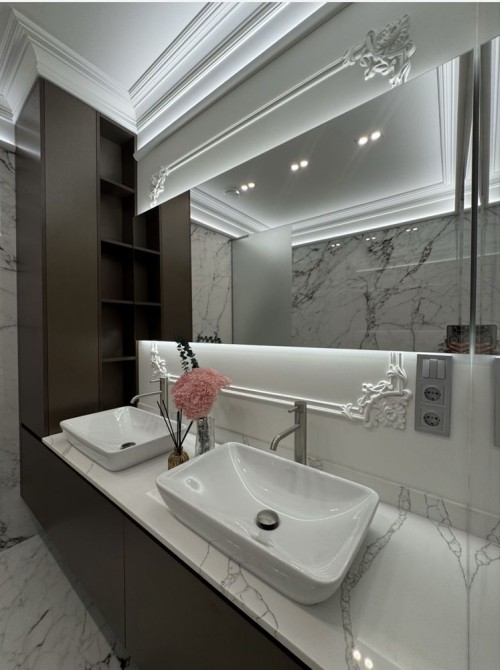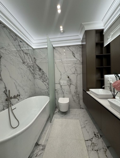 Два санвузли - в одному окремо стояча ванна в іншому душова, італійська сантехніка bugnatesse та широкоформатний керамограніт розміром 260 на 120.
