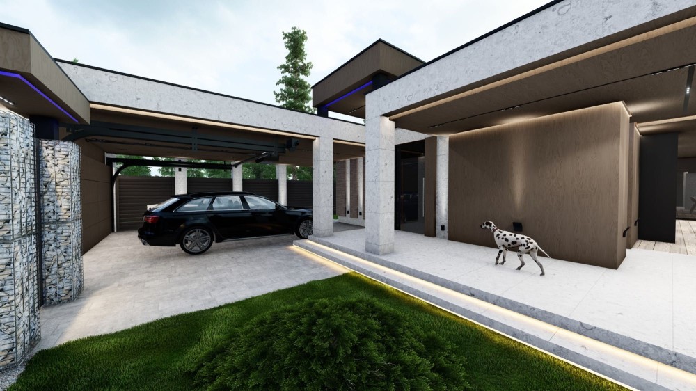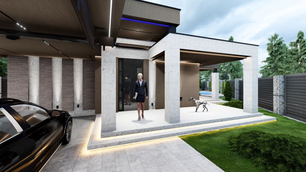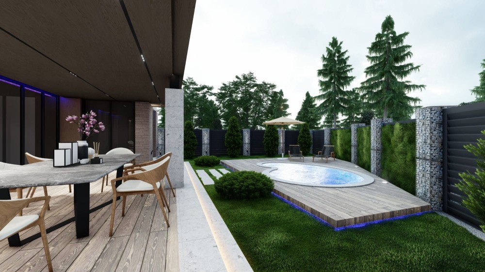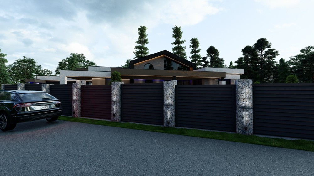 1-а поверховий будинок , великій двір, тераса, басейн, зелені насадження. На даному етапі залитий фундамент, зведеніі стіни, тераса, та інше оздоблення.