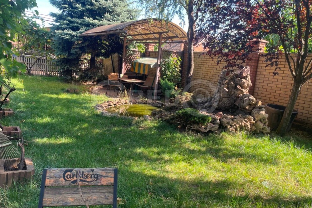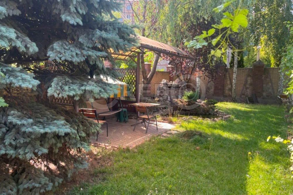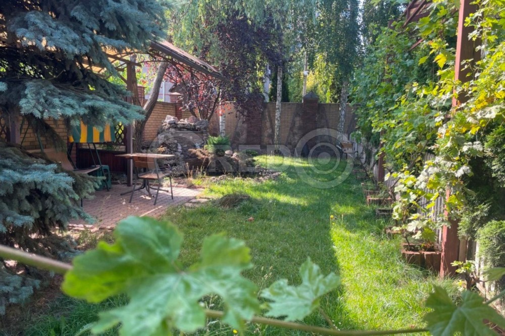 На ділянці в 10 соток з ландшафтним дизайном є зона відпочинку, мангальна зона. Невелике озеро, хвойні дерева.