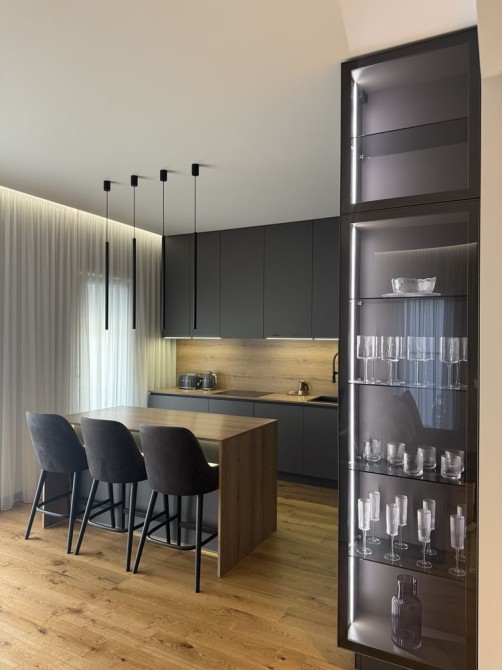 Встановлена якісна кухня з островом, панорамні вікна, вихід на терасу.