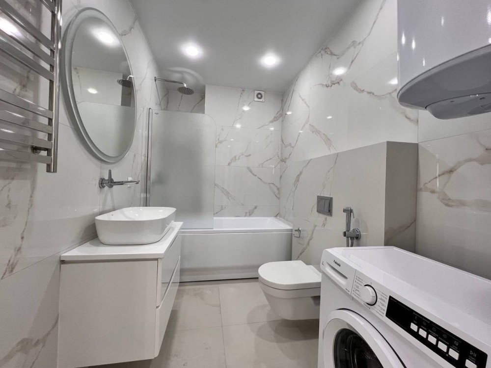 Світлий санвузол з багаторівневим підсвічуванням, повністю укомплектований усім необхідним.