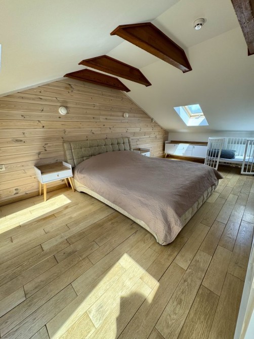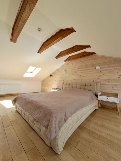 Перший поверх - коридор, кухня-вітальня, санвузол, на другому поверсі розташовані дві кімнати та санвузол, третій поверх (мансардний)спальня, всі кімнати мають покриття -дубова дошка;