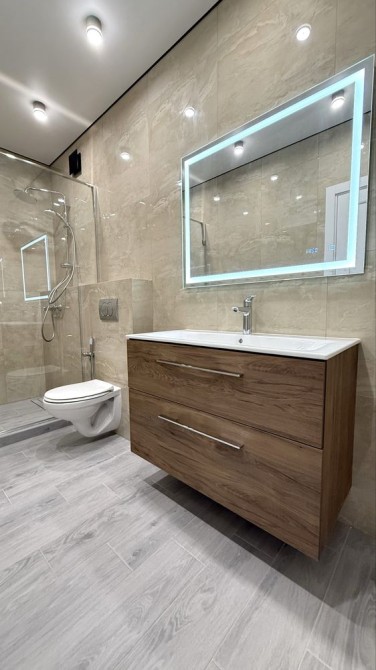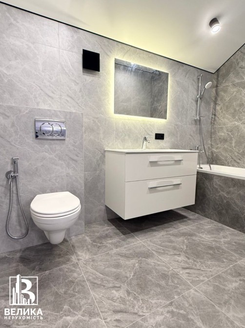 - просторий санвузол з душовою кабіною, сантехніка Grohe, інсталяція унітаз Geberit, гігієнічний душ, велике красиве дзеркало з підсвіткою, навісна тумба