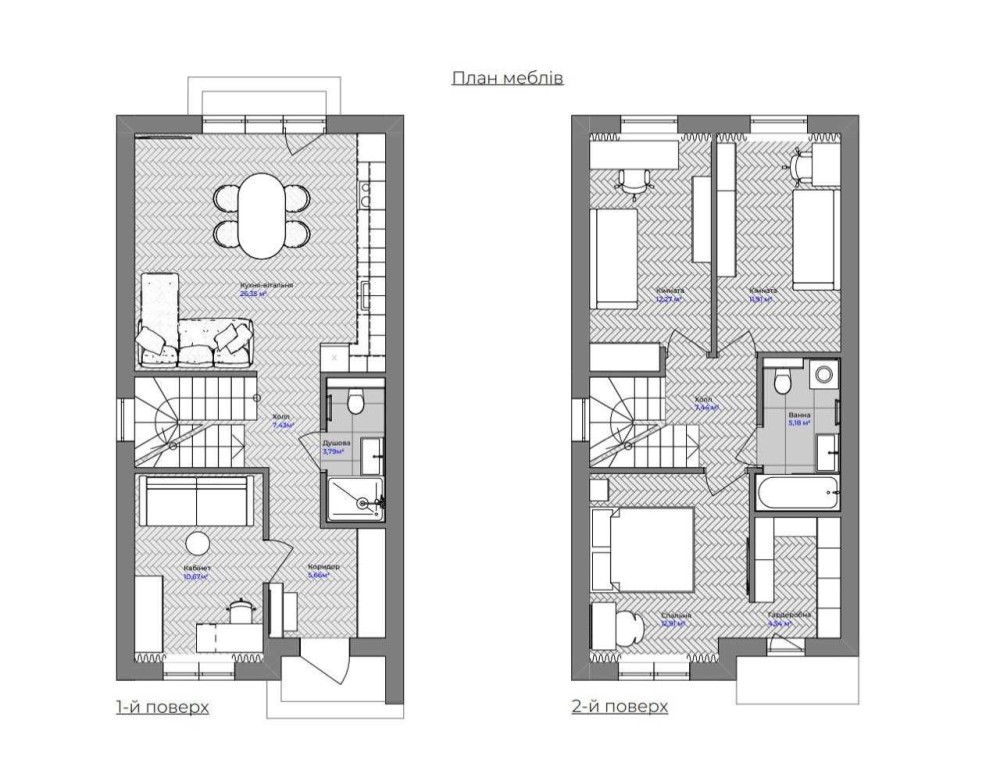 Площа одного будинку - 103 м2 (3 та 4 секція додатково 40 м2 на третьому поверсі)