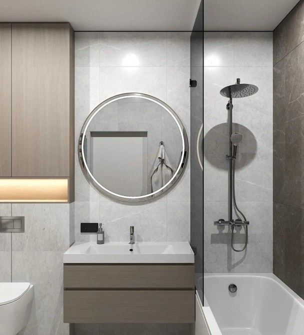 Використані якісні матеріали: керамограніт великого формату, вологостійкі оздоблювальні матеріали, сучасні текстури дерева та каменю